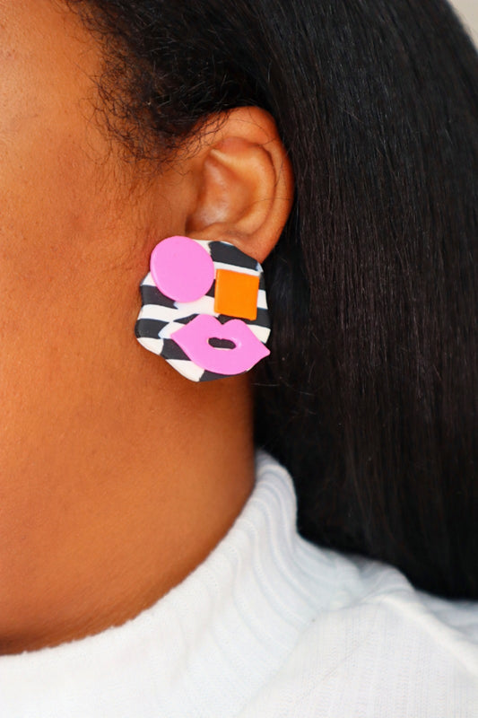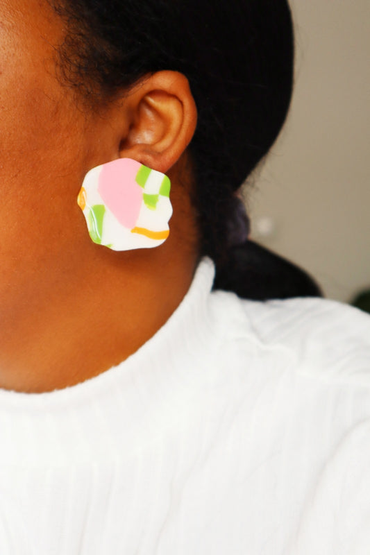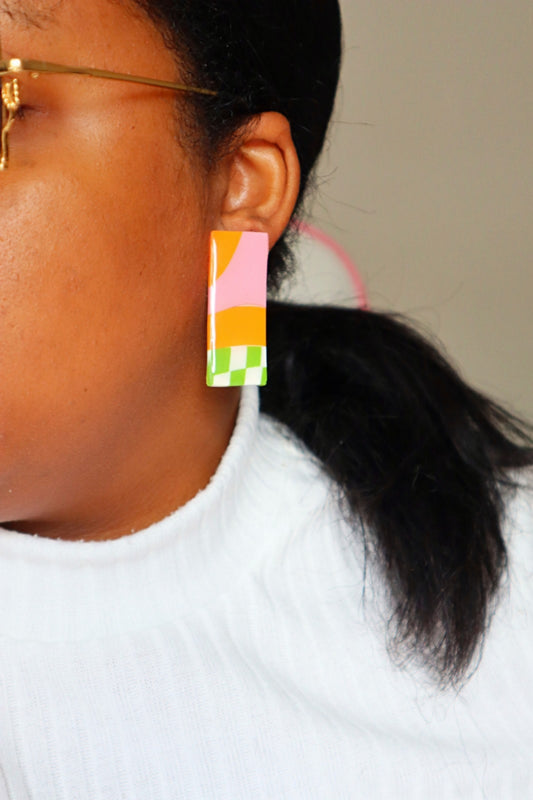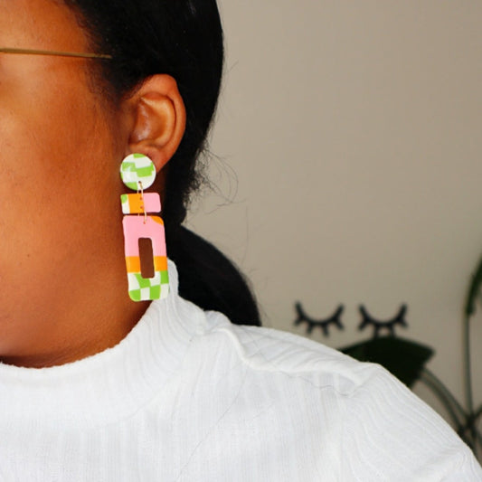 Zesty Muse-Cerise-Handcrafted Polymer Clay Earrings | Stainless Steel Studs | Organic Design Pink, Orange Doodle & Lime Green Checkered Pattern