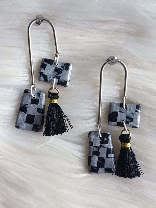 Sleek and Chic: Polymer Clay Earrings with Silver Stainless Steel and Black Tassels - Abstract Polymer clay earrings- earrings with Black Tassels