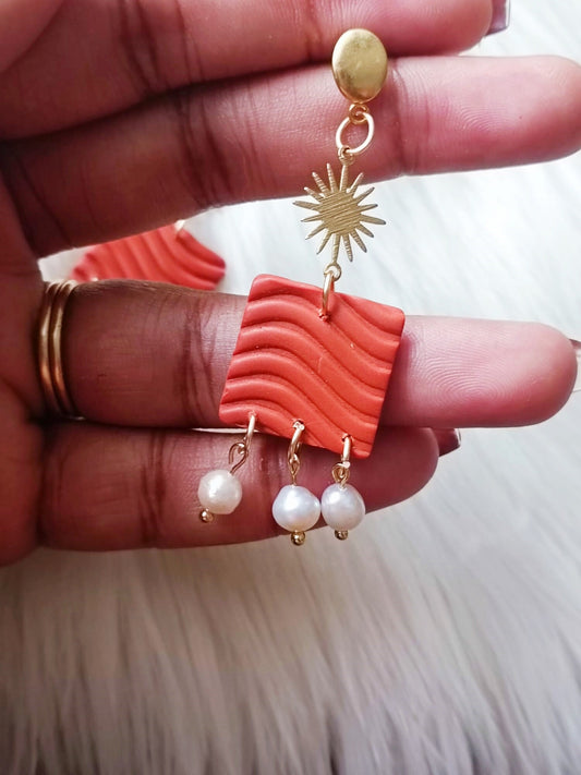 Handcrafted Terracotta Polymer Clay Dangle Earrings 'Nabila' with 3D Waves, Freshwater Pearls, and Tarnish-Free Stainless Steel Charms
