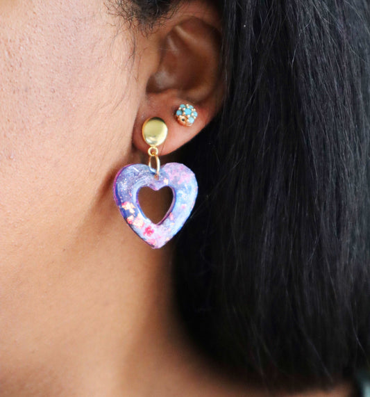 Elevate Your Look with Heart-Shaped Abstract Polymer Clay Dangle Earrings | Handcrafted Unique Designs with Stainless Steel Hardware and Vibrant and Cosmic Color Palette
