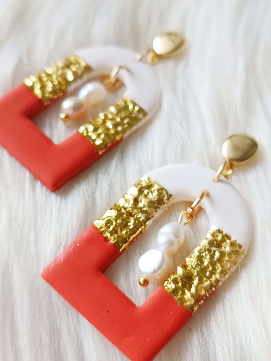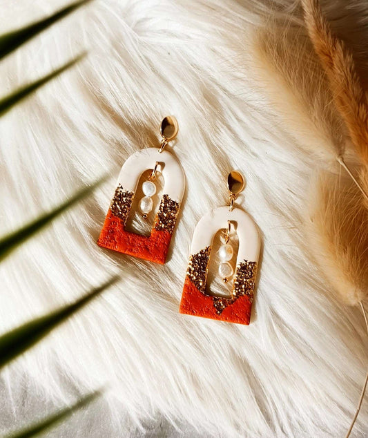 Terracotta Patterned Arch Earrings - Hodiah - Terracotta arche with white and gold details and freshwater pearls