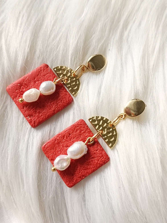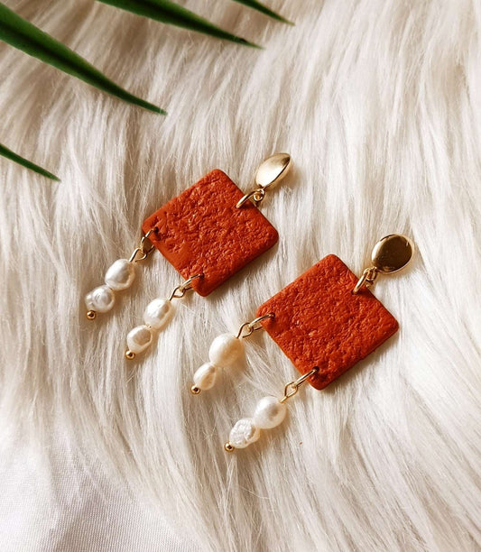 Terracotta Minimalist Polymer clay earrings - ANIKA- Terracotta textured earrings with freshwater pearls