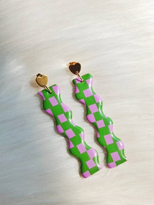 Boucles d’oreilles en damier violet et vert en forme d’argile polymère pendantes | Boucles d’oreilles à carreaux /Boucles d’oreilles à carreaux/ Andreina Clay