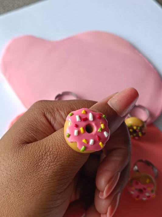 Donut Ring anneaux d’argile faits à la main polymère argile bijoux alimentaires anneaux fraise rose givré saupoudrer anneau de beignet réglable-Andreina Clay